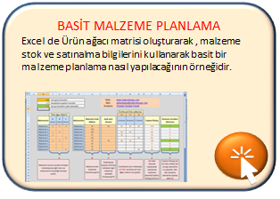 Basit malzeme planlama nasýl yapýlýr: Excel de Ürün aðacý matrisi oluþturarak , mazleme stok ve satýnalma bilgilerinide kullanarak basit bir malzeme planlama nasýl yapýlacaðýnýn örneðidir. Basit sonlu kapasite nasýl yapýlýr: Excel de Çalýþma takvimi oluþturarak sonlu kapasite planlama nasýl yapýlacaðýnýn örneðidir.
