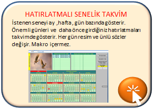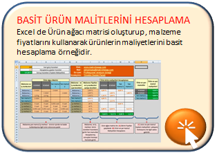 Ürünlerin maliyetleri basit nasýl hesaplanýr: Excel de Ürün aðacý matrisi oluþturup , mazleme fiyatlarýný kullanarak ürünlerin maliyetini basitçe hesaplayan excel örneðidir. Hatýrlatmalý Takvim : Makro içermez. Her gün deðiþen resim, sene butonuna basýldýðýnda otomatik hesaplanan senelik takvim, önemli gün ve hatýrlatmalarý takvimde göstermek, deðiþken köprü fonksiyonu kullanýlarak hatýrlatma iþlevini gerçekleþtirmek.