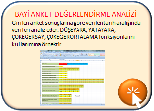 Bayi anket deðerlendirme analizi : Girilen anket sonuçlarýna göre verilen tarih aralýðýnda verileri analiz eder. DÜÞEYARA, YATAYARA, ÇOKEÐERSAY, ÇOKEÐERORTALAMA fonksiyonlarýný kullanýmýna örnektir .