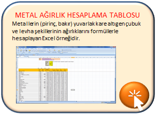 Metal aðýrlýk hesaplama tablosu : Metallerin (pirinç, bakýr) yuvarlak kare altýgen çubuk ve levha þekillerinin aðýrlýklarýný formüllerle hesaplayan Excel örneðidir.