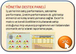 Yönetim destek panali: Ýþ yerlerinin satýþ performansýný, satýnalma performansý ,üretim performansýný vb. gibi takip etmenizi ve kolay analiz yamanýzý saðlar. Excel'in makro ve kendi özelliklerini kullanarak sahip olduðunuz mrp veya erp programýnýn veri tabanýndan otomatik veriyi alarak raporlama yapar. Linkte örneðini görebilirsiniz